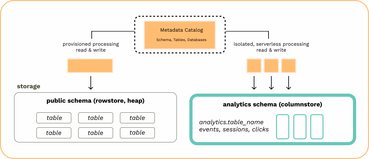 To join a standard PostgreSQL rowstore “heap” table with an analytics columnstore table, use a standard JOIN operation. The database handles the differences between row-based and columnar storage internally during table creation, allowing joins to be performed as usual. example: consider high volume events and audit logs in the columnstore and user data in the rowstore tables.Switching the default table type to the Postgres rowstore