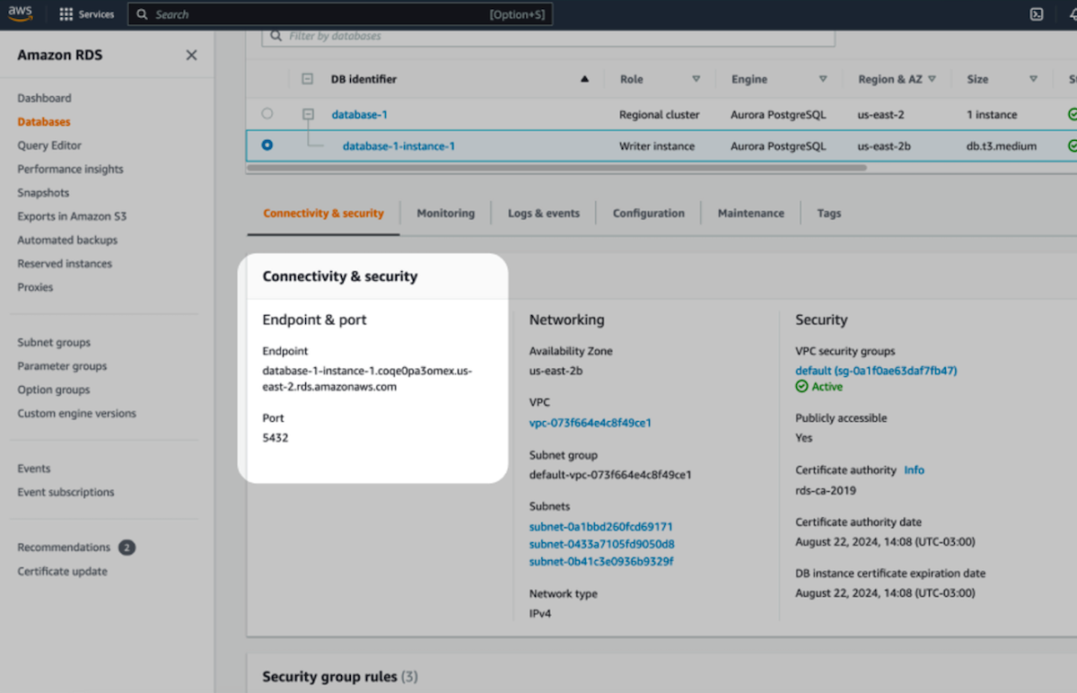 - In the Connectivity & Security tab, note down the Endpoint and the port number.